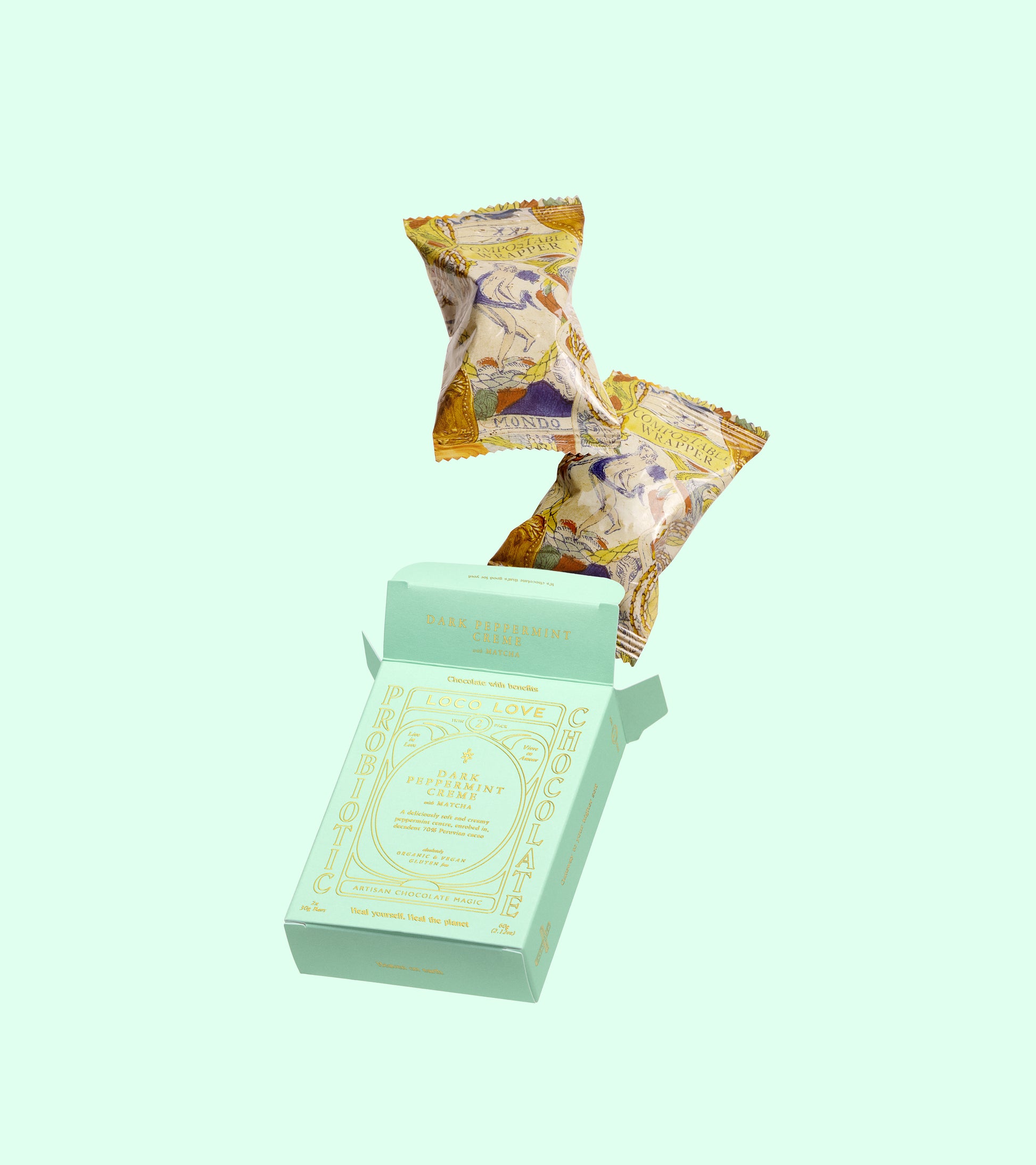 Cacao paste*, coconut blossom sugar*, cacao butter*, tapioca fibre*, coconut milk powder*, coconut oil*, peppermint oil*, vanilla powder*, probiotic (Bacillus coagulans), birch xylitol*, ceremonial matcha powder*