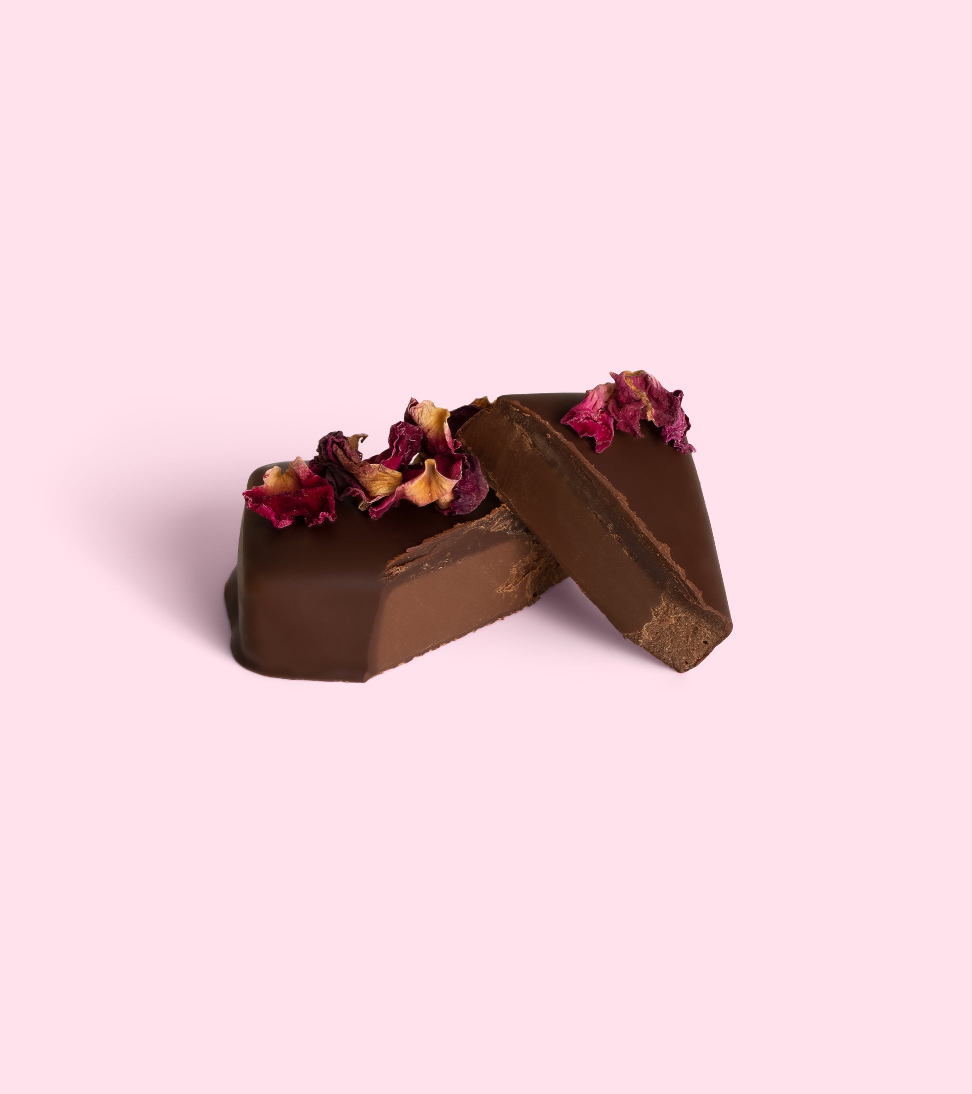 cacao paste*, coconut blossom sugar *, cacao butter*, tahini* (sesame), coconut oil*, rose petals* (1%), goji berry* (2%), Bulgarian rose essential oil* (1%), probiotic (Bacillus coagulans), Australian sea salt | Contains sesame | Cacao solids 53.9%
