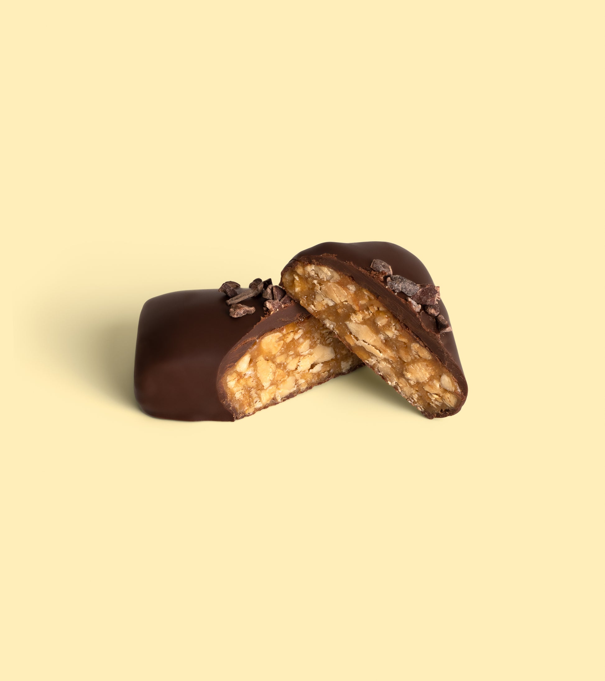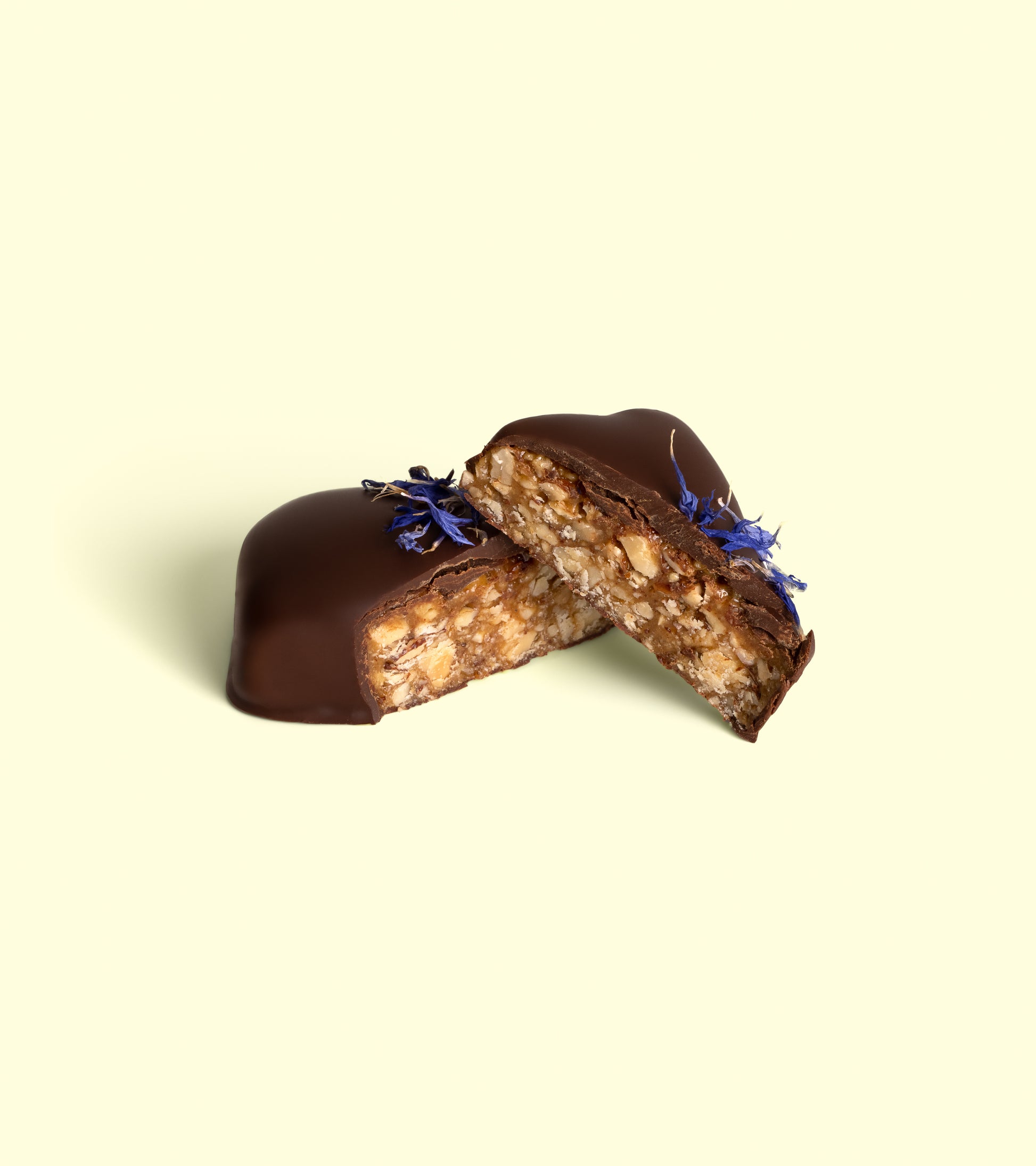 Australian almonds (36.4%), cacao paste*, coconut blossom sugar*, cacao butter*, brown rice syrup*, coconut milk*, astragalus powder* (0.5%), probiotic powder (Bacillus coagulans) (0.09%), cold pressed caramel extract* (0.01%) , Australian sea salt, blue corn flower petal*, tamari* | Contains almonds/fermented soy | Cacao solids 25%