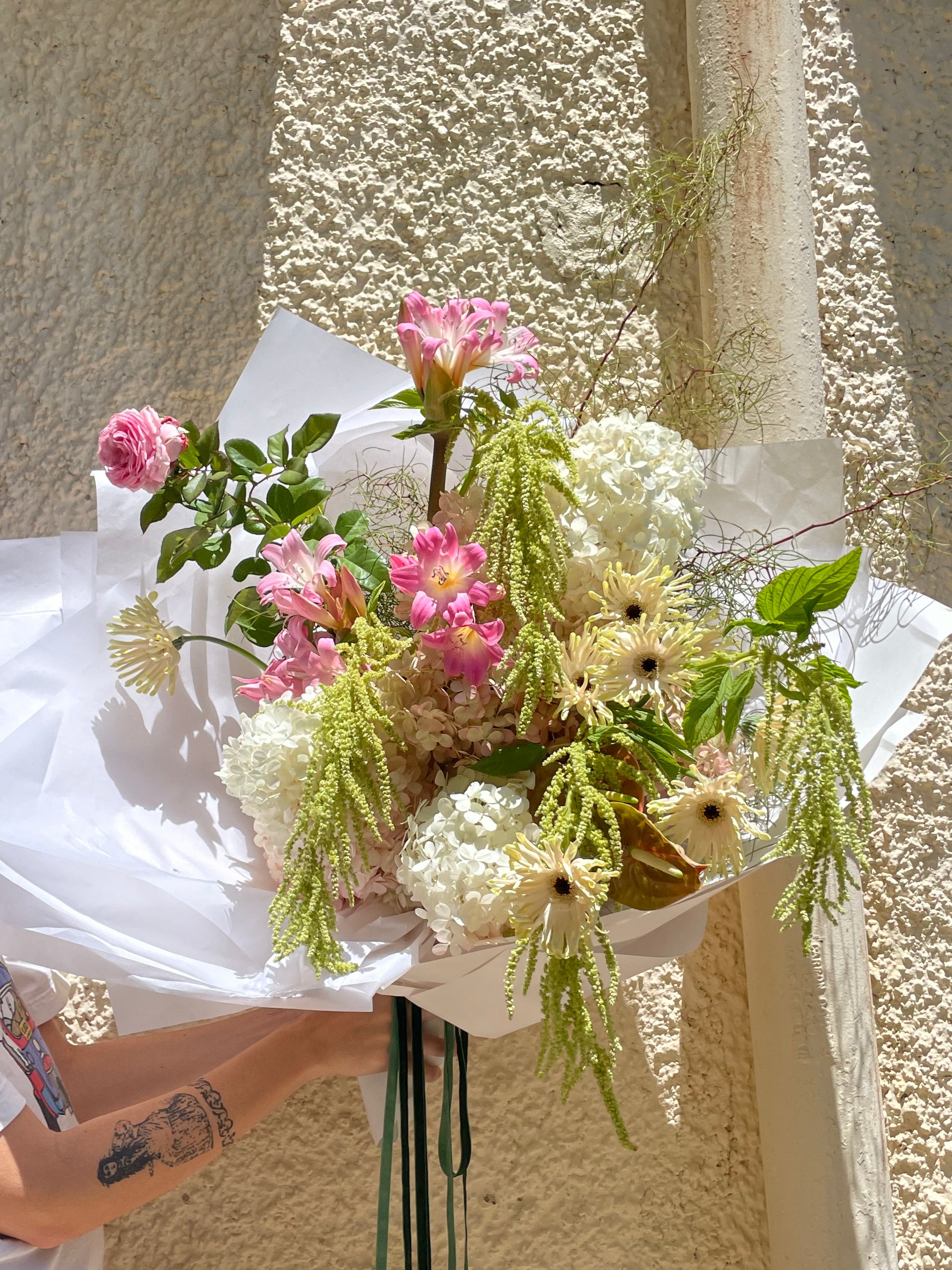 Due to seasonal sourcing, please expect floral variations from what is pictured. Our arrangements come wrapped in white paper with matching ribbon and a water pack base, unless a vase is added to the order.